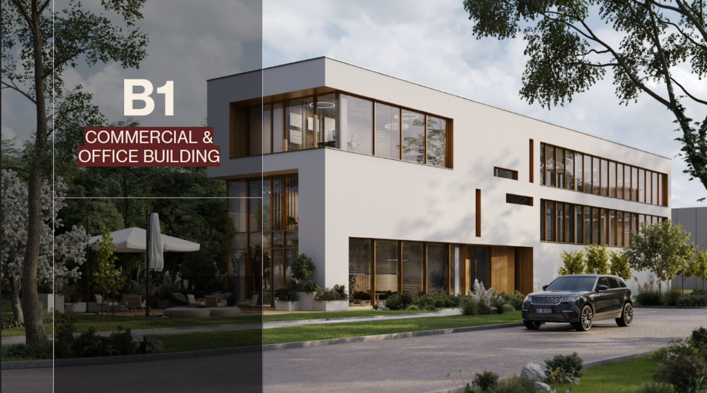 Clădire destinată spațiilor de birouri și funcțiunilor comerciale, integrată într-un mediu verde, cu acces facil și arhitectură modernă.